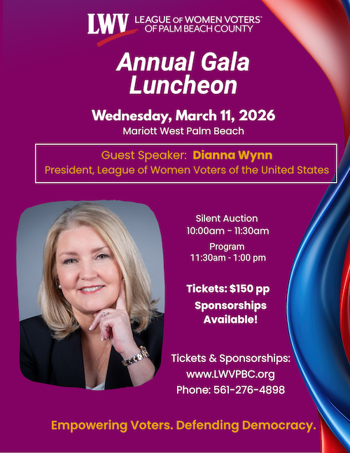 The League of Women Voters of Palm Beach County (LWVPBC) will host its Annual Gala Luncheon at the Marriott Hotel, West Palm Beach, on March 11, 2026.
